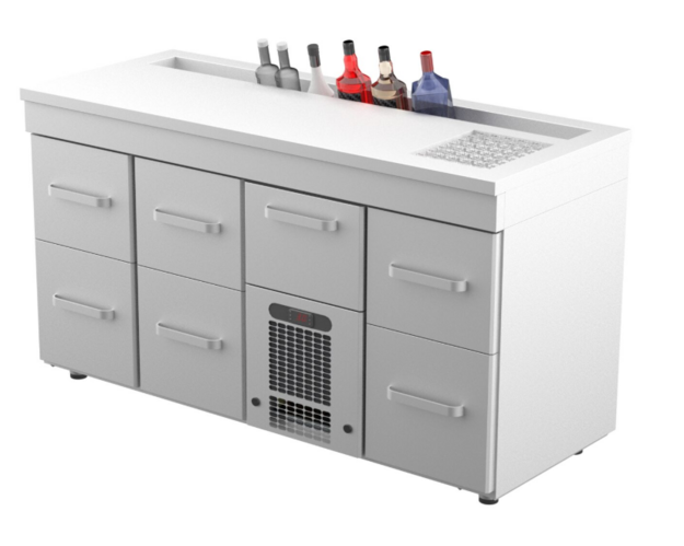 Työpöydän kannessa on käyttäjään päin kallistettu pullokouru sekä allas pulloille tai jääpaloille.
