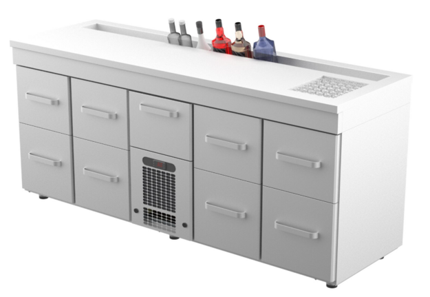 Työpöydän kannessa on käyttäjään päin kallistettu pullokouru sekä allas pulloille tai jääpaloille.