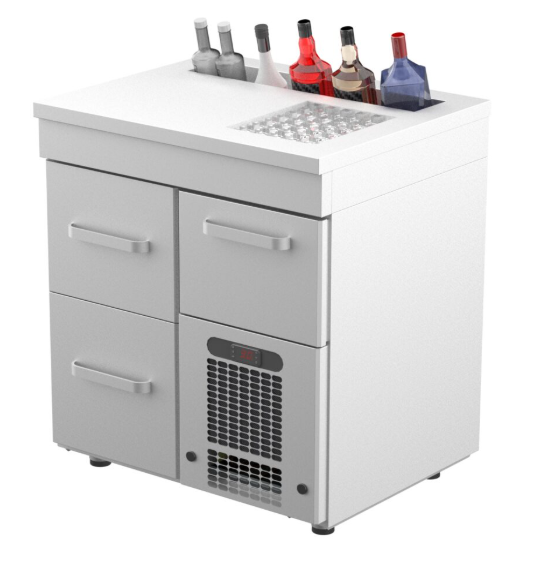 Työpöydän kannessa on käyttäjään päin kallistettu pullokouru sekä allas pulloille tai jääpaloille.