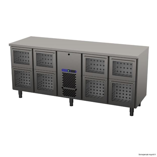 Laitteet » Kahvinvalmistus & baarilaitteet » Baarimestarin pöydät, juomavetolaatikostot ja pulloaltaat » Juomavetolaatikostot, lasiluukuilla » Juomavetolaatikosto lasiluukuilla Restmec VLOL 2008 Juomavetolaatikosto lasiluukuilla Restmec VLOL 2008 Ulkomitat: (l) 2000 x (s) 650 x (k) 900 mm.Sähköteho: 0,6 kW / 230 V.Kalusteen päällä on ruostumattomasta teräksestä oleva työskentelytaso.8 kpl vetolaatikkoja, joissa läpinäkyvä etuosa sekä valaistus tuotteille. Lisätiedot › Tarjouksen mukaan Määrä Lisää tarjouspyyntöön Ulkomitat: (l) 2000 x (s) 650 x (k) 900 mm.Sähköteho: 0,6 kW / 230 V.Energiatehokas ja ympäristöystävällinen R290 kylmäaine.Kalusteen päällä on ruostumattomasta teräksestä oleva työskentelytaso.8 kpl vetolaatikkoja, joissa läpinäkyvä etuosa sekä valaistus tuotteille.Vetolaatikoissa on siirrettävä väliseinä, joilla saadaan laatikko näyttämään täydeltä ulospäin.Laatikot ovat varustettu 110 % avautuvilla kuulalaakeroiduilla teleskooppikiskoilla, joiden ansiosta laatikoilla asiointi käy vaivattomasti.Vetolaatikoissa on magneettitiivisteet.Magneettitiivisteet ja teleskooppikiskot ovat irroitettavissa puhdistusta varten.Kalusteessa selkeä digitaalisella näytöllä varustettu lämpötilansäädin.Lämpötilansäätö kalusteessa +2…+8˚C.Automaattinen sulatus.Kylmäkonekasetissa on irrotettava ja pestävä lauhdutusilmansuodatin.Kalusteen näkyvät osat ovat valmistettu 18/8 ruostumattomasta teräksestä.Lämpöeristeenä CFC-vapaa polyuretaani.Alla säätöjalat. Näytä lisää tuotteitaJuomavetolaatikostot, lasiluukuilla tuoteryhmästä Tämäkin laite sopivasti rahoituksella Tutustu ›