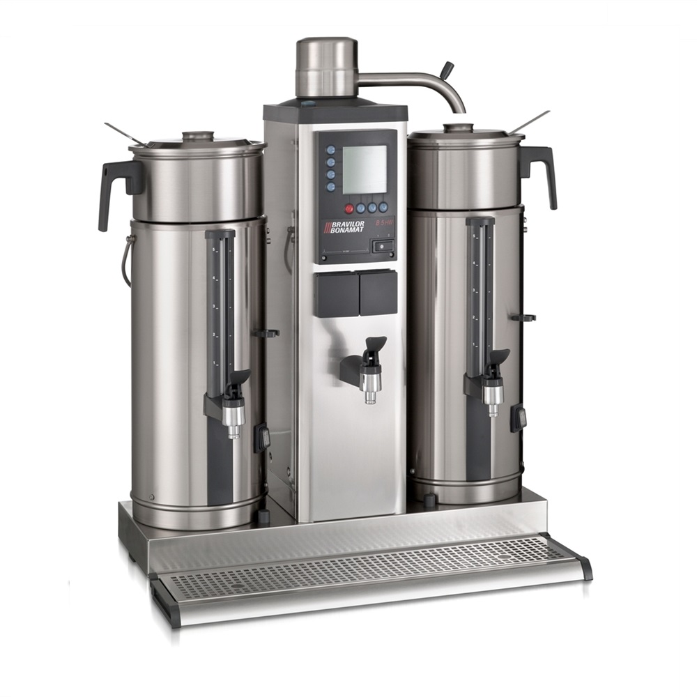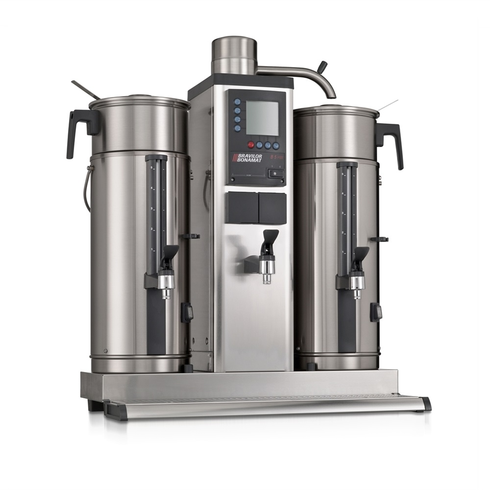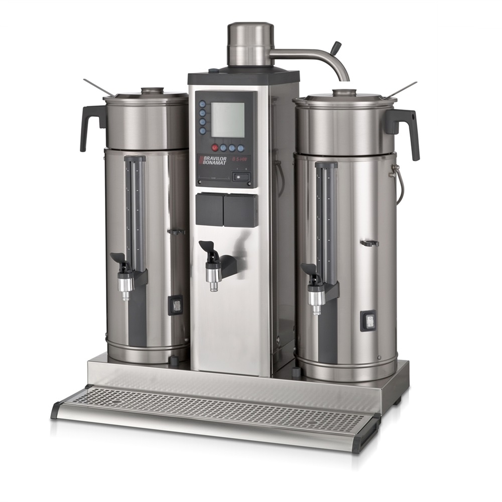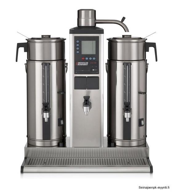 Laitteet » Kahvinvalmistus & baarilaitteet » Kahvinkeittimet ja lämpösäilyttimet » Säiliökahvinkeittimet » Säiliökahvinkeitin, kuumavesihanalla Bravilor Bonamat B5 HW, 2 x 5 litraa Säiliökahvinkeitin, kuumavesihanalla Bravilor Bonamat B5 HW, 2 x 5 litraa Keittoyksikössä teevesihana.2 x 5 litran kahvisäiliöillä.Suodatusaika noin 10 minuuttia per säiliö.Ulkomitat: (l) 790 x (s) 570 x (k) 799 mm.Sähköteho: 5,33 kW / 400 V. Lisätiedot › Tarjouksen mukaan Määrä Lisää tarjouspyyntöön Videolla kuumavesihanalla varustettu B10 HW säiliökahvinkeitin. Videosta poiketen B5 HW malli on 2 x 5 litran säiliöllä varustettu.Ulkomitat: (l) 790 x (s) 570 x (k) 799 mmSähköteho: 5,33 kW / 400 VKylmävesiliitäntä / automaattinen vedenotto.Keittoyksikössä teevesihana.Kahvinkeittimessä on digitaalinen ohjauspaneeli, josta voit valita keittomäärän.Kahvinkeitto tapahtuu yhteen säiliöön kerrallaan.Suodatusaika noin 10 minuuttia per säiliö.Keittimessä on ominaisuutena äänimerkki keiton päätyttyä.Kahvinkeittimen valmistusteho kokonaisuudessaan noin 30 litraa tunnissa.Kuumaveden tuotantokapasiteetti noin 20 litraa tunnissa.Vakiovarusteena paketissa on mukana 2 kpl säiliöitä ja 2 kpl 2 kpl suodatinyksiköitä, 2 kpl säiliöiden kansia ja tippa-allas.Säiliön tilavuus on 5,0 litraa. Säiliöt ovat varustettu hanoilla ja mittalasilla.Säiliöt ovat varustettu sähköjohdolla ja ne ovat nostettavissa esimerkiksi tarjoilulinjastoon. Näytä lisää tuotteitaSäiliökahvinkeittimet tuoteryhmästä Tämäkin laite sopivasti rahoituksella Tutustu ›