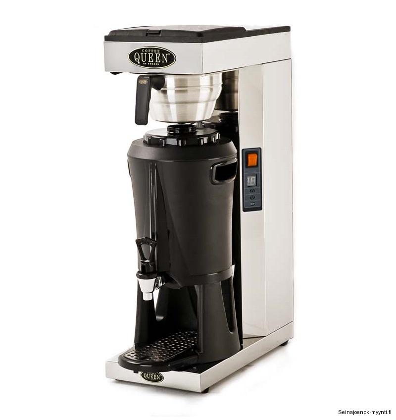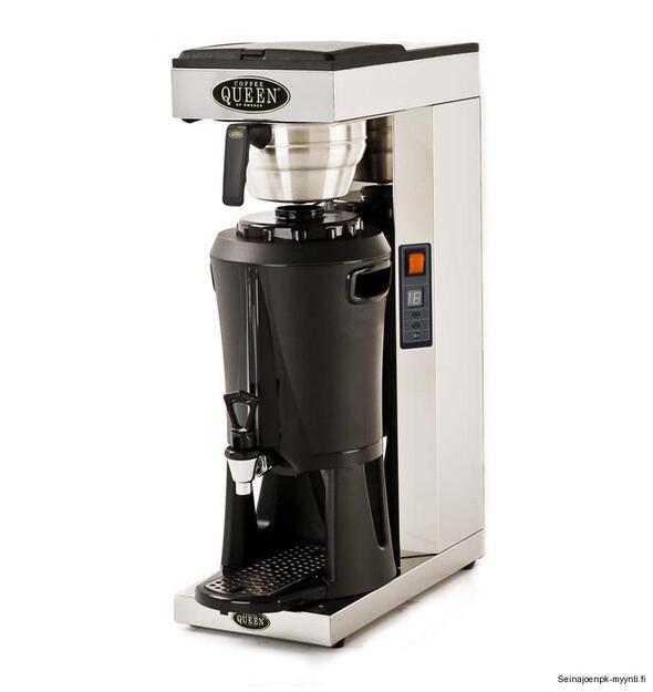 Laitteet » Kahvinvalmistus & baarilaitteet » Kahvinkeittimet ja lämpösäilyttimet » Säiliökahvinkeittimet » Termossäiliö kahvinkeitin Coffee Queen Mega Gold A, vesiliitäntä malli Termossäiliö kahvinkeitin Coffee Queen Mega Gold A, vesiliitäntä malli Ulkomitat: (l) 205 x (s) 455 x (k) 655 mm.Sähköteho: 2,2 kW / 230 V.Vesiliitäntä malli.Termossäiliön tilavuus on 2,5 litraa.Suodatusaika on noin 8 ½ minuuttia per säiliö.Kapasiteetti on noin 19 litraa tunnissa.Tuotekoodi: 1032. Lisätiedot › Tarjouksen mukaan Määrä Lisää tarjouspyyntöön Ulkomitat: (l) 205 x (s) 455 x (k) 655 mm.Sähköteho: 2,2 kW / 230 V.Kylmävesiliitäntä 1/2".Kahvinkeittimessä on ohjauspaneeli automaattista vedentäyttöä varten.Ohjauspaneelin avulla voit säätää kullakin kerralla suodatettavien kupillisten määrän. Suodatusvaihtoehdot 4-17 kuppia.Suodatusaika on noin 8 ½ minuuttia per säiliö.Keittimessä on ominaisuutena äänimerkki keiton päätyttyä.Kapasiteetti on noin 19 litraa tunnissa.Vakiovarusteena paketissa on mukana 1 kpl termossäiliö, 1 kpl suodatinsuppilo, 25 kpl suodatinpapereita ja 1 kpl vedenottoletku.Termossäiliön tilavuus on 2,5 litraa.Termossäiliö kahvinkeittimessä käytetään 90 mm suppilosuodatinpaperia.Tuotekoodi: 1032.Kahvinkeittimeen on saatavilla lisävarusteena termossäiliöitä sekä säiliöiden päälle asetettavia näyttäviä esillepanokansia, joissa voit kommunikoida asiakkaaan kanssa joko haluamallasi kuvalla tai vaihtoehtoisesti Coffee Queenin omilla "Coffee" tai "Hot water" kuvilla. Näytä lisää tuotteitaSäiliökahvinkeittimet tuoteryhmästä Tämäkin laite sopivasti rahoituksella Tutustu ›