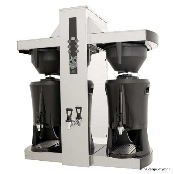 Laitteet » Kahvinvalmistus & baarilaitteet » Kahvinkeittimet ja lämpösäilyttimet » Säiliökahvinkeittimet » Termossäiliö kahvinkeitin, kuumavesihanalla Coffee Queen Tower, 2 x 5,0 litraa Termossäiliö kahvinkeitin, kuumavesihanalla Coffee Queen Tower, 2 x 5,0 litraa Ulkomitat: (l) 930 x (s) 500 x (k) 950 mm.Sähköteho: 9,0 kW / 400 V.Vesiliitäntä malli.Varustettu 2 x 5,0 litran termossäiliöllä, joihin voit keittää yhtä aikaa.Suodatusaika 2 x 5,0 litraa noin 7 minuuttia.Kapasiteetti on noin 350 kuppia tunnissa.Tuotekoodi: 1011. Lisätiedot › Tarjouksen mukaan Määrä Lisää tarjouspyyntöön Kahvinkeitin Coffee Queen Tower on nopea ja helppokäyttöinen kahvinkeitin teevesihanalla. Suuren kapasiteetin ansiosta se soveltuu erinomaisesti ravintolaan, kahvilaan, liikenneasemille sekä muihin suuren kahvinkulutuksen omaaviin paikkoihin. Keitin valmistaa kahvia suoraan 5 litran termossäiliöihin. Termossäiliöissä on käytännöllinen hana, mitta-asteikko kahvimäärän näkemiselle, integroidut kahvat ja irrotettava tipparitilä.Ulkomitat: (l) 930 x (s) 500 x (k) 950 mm.Sähköteho: 9,0 kW / 400 V.Kylmävesiliitäntä 1/2".Kahvinkeittimessä on ohjauspaneeli, josta voit valita täyden keiton (5,0 litraa) tai puoli keiton (2,5 litraa).Suodatusaika on noin 7 minuuttia per säiliö.Kumpaankin säiliöön keittäessäsi yhtä aikaa, saat valmista kahvia seitsemään minuuttiin 10 litraa.Keittimessä on ominaisuutena äänimerkki keiton päätyttyä.Kapasiteetti on noin 350 kuppia tunnissa.Vakiovarusteena paketissa on mukana 2 kpl termossäiliöitä ja 2 kpl suodatinsuppiloita ja vedenottoletku.Termossäiliön tilavuus on 5,0 litraa.Termossäiliö kahvinkeittimessä käytetään Tower 523 suodatinpapereita.Tower mallissa on lisäksi kuumavesihana.Tuotekoodi: 1011.Kahvinkeittimeen on saatavilla lisävarusteena termossäiliöitä sekä säiliöiden päälle asetettavia näyttäviä esillepanokansia, joissa voit kommunikoida asiakkaaan kanssa joko haluamallasi kuvalla tai vaihtoehtoisesti Coffee Queenin omilla "Coffee" tai "Hot water" kuvilla. Näytä lisää tuotteitaSäiliökahvinkeittimet tuoteryhmästä Tämäkin laite sopivasti rahoituksella Tutustu ›