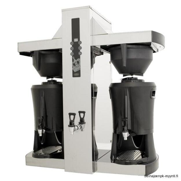 Säiliökahvinkeitin Bravilor Bonamat B10 2 x 10 litran kahvisäiliöillä.Suodatusaika noin 10 minuuttia per säiliö.Ulkomitat: (l) 955 x (s) 512 x (k) 840 mmSähköteho: 6,18 kW / 400 V OSTA Säiliökahvinkeitin, kuumavesihanalla Bravilor Bonamat B20 HW, 2 x 20 litraa Keittoyksikössä teevesihana.2 x 20 litran kahvisäiliöillä.Suodatusaika noin 14 minuuttia per säiliö.Ulkomitat: (l) 1173 x (s) 600 x (k) 947 mm.Sähköteho: 11,44 kW / 400 V. OSTA Pahviprintti "Coffee" Tower 2,5 litran säiliön esillepanokanteen Tuotekoodi: 4703.Tämä tuotekoodi sisältää ainoastaan esillepanokanteen laitettavan kuvan. Ei itse esillepanokantta. OSTA Termossäiliö kahvinkeitin, kuumavesihanalla Coffee Queen Tower, 2 x 5,0 litraa Ulkomitat: (l) 930 x (s) 500 x (k) 950 mm.Sähköteho: 9,0 kW / 400 V.Vesiliitäntä malli.Varustettu 2 x 5,0 litran termossäiliöllä, joihin voit keittää yhtä aikaa.Suodatusaika 2 x 5,0 litraa noin 7 minuuttia.Kapasiteetti on noin 350 kuppia tunnissa.Tuotekoodi: 1011. OSTA Suppilosuodatinpaperipaketti Fredman 457/152 mm Soveltuu Bravilor Bonamat B10 ja B10 HW säiliökahvinkeittimiin, joissa on suodatinyksiköissä lisävarusteena suppilosuodatinteline.Paketissa on 250 kpl suppilosuodatinpapereita.Tuotekoodi: 4667. OSTA
