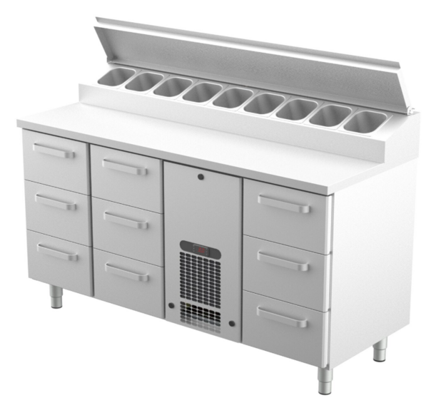 9 kpl kylmävetolaatikoita, joiden kapasiteetti on GN 1/1-150.