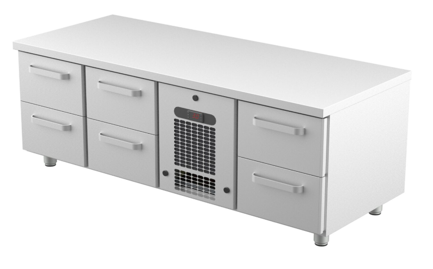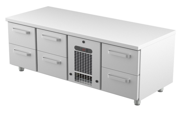 6 kpl kylmävetolaatikkoja, joiden kapasiteetti on GN 1/1-150.