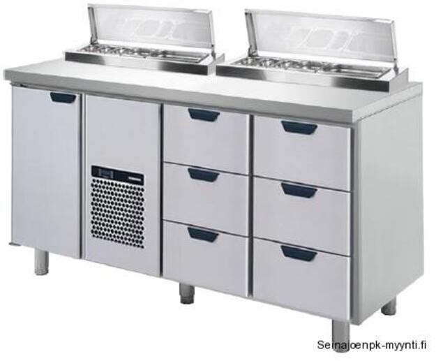 Pizzan leivontapöytä Porkka P/S-1-CDE-3/85 Ulkomitat: (l) 1260 x (s) 850 x (k) 900/1150 mm.Kannen takaosassa on kallistettu kylmäkaukalo 3 x GN 1/3-150 ja GN 1 x 1/6-150 astioille.1 kpl kylmäkaappi ja 4 kpl kylmävetolaatikoita, joiden kapasiteetti on 3 x GN 1/1-150 GN ja 1 x GN 1/1-200. OSTA Pizzan leivontapöytä Restmec VLE 1617, jauhoreunoilla Ulkomitat: (l) 1600 x (s) 650 x (k) 900 + jauhoreunat 100 mm.Työpöytätasoa kiertää takaa ja sivuilta korotetut jauhoreunat.1 kpl kylmäkaappi ja 7 kpl kylmävetolaatikkoja.Laatikoiden kapasiteetti on GN 1/1-150. OSTA Pizzan leivontapöytä Porkka P/S-1-CHE-3-3/85 Ulkomitat: (l) 1660 x (s) 850 x (k) 900/1150 mm.Kannen takaosassa on kallistettu kylmäkaukalo 4 x GN 1/3-150 astioille.1 kpl kylmäkaappi ja 6 kpl kylmävetolaatikoita, joiden kapasiteetti on GN 1/1-150. OSTA Pizzan leivontapöytä Restmec VLE 1214, jauhoreunoilla Ulkomitat: (l) 1200 x (s) 650 x (k) 900 + jauhoreunat 100 mm.Työpöytätasoa kiertää takaa ja sivuilta korotetut jauhoreunat.1 kpl kylmäkaappi ja 4 kpl kylmävetolaatikkoja.Laatikoiden kapasiteetti on 1 x GN 1/1-200 ja 3 x GN 1/1-150. OSTA Pizzan leivontapöytä Restmec PVLE-2027 Ulkomitat: (l) 2000 x (s) 800 x (k) 900/1200 mm.Päällä kylmäkaukalo 100 mm syville GN-astioille.2 kpl kylmäkaappeja ja 7 kpl kylmävetolaatikkoja. OSTA