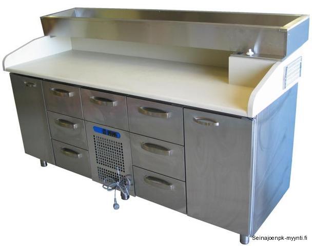 Pizzan leivontapöytä Porkka P/S-1-CHE-3-3/85 Ulkomitat: (l) 1660 x (s) 850 x (k) 900/1150 mm.Kannen takaosassa on kallistettu kylmäkaukalo 4 x GN 1/3-150 astioille.1 kpl kylmäkaappi ja 6 kpl kylmävetolaatikoita, joiden kapasiteetti on GN 1/1-150. OSTA Pizzan leivontapöytä Restmec VLE 1617, jauhoreunoilla Ulkomitat: (l) 1600 x (s) 650 x (k) 900 + jauhoreunat 100 mm.Työpöytätasoa kiertää takaa ja sivuilta korotetut jauhoreunat.1 kpl kylmäkaappi ja 7 kpl kylmävetolaatikkoja.Laatikoiden kapasiteetti on GN 1/1-150. OSTA Pizzan leivontapöytä Restmec VLE 1214, jauhoreunoilla Ulkomitat: (l) 1200 x (s) 650 x (k) 900 + jauhoreunat 100 mm.Työpöytätasoa kiertää takaa ja sivuilta korotetut jauhoreunat.1 kpl kylmäkaappi ja 4 kpl kylmävetolaatikkoja.Laatikoiden kapasiteetti on 1 x GN 1/1-200 ja 3 x GN 1/1-150. OSTA Pizzan leivontapöytä Porkka P/S-1-CDE-3/85 Ulkomitat: (l) 1260 x (s) 850 x (k) 900/1150 mm.Kannen takaosassa on kallistettu kylmäkaukalo 3 x GN 1/3-150 ja GN 1 x 1/6-150 astioille.1 kpl kylmäkaappi ja 4 kpl kylmävetolaatikoita, joiden kapasiteetti on 3 x GN 1/1-150 GN ja 1 x GN 1/1-200. OSTA Pizzan leivontapöytä Restmec PVLE-2027 Ulkomitat: (l) 2000 x (s) 800 x (k) 900/1200 mm.Päällä kylmäkaukalo 100 mm syville GN-astioille.2 kpl kylmäkaappeja ja 7 kpl kylmävetolaatikkoja. OSTA