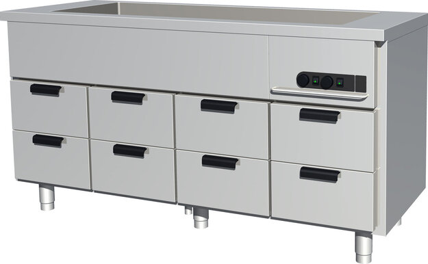 Tehokkaan eristyksen ansiosta lämpökalusteet eivät säteile ympäristöön turhaa lämpöä. Puhaltimella tehostettu ilmankierto takaa tasaisen lämminilmakierron vetolaatikoissa. Kalusteet on valmistettu korkealaatuisista komponenteista ja niiden näkyvät sisä- ja ulkopinnat ovat ruostumatonta terästä.