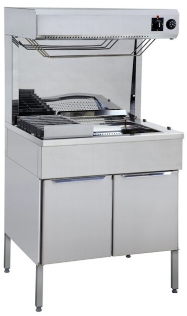 Suolausallasritilä GN 1/1-100 astiaan Rei’itetty pelti, jossa toinen pää on viistosti nouseva.Asetetaan GN 1/1-100 astiaan (gn-astia ei sisälly hintaan).Tuotekoodi: 3302. OSTA Ranskanperuna-asema lämpölampuilla Ranskanperuna-asema lämpölampuilla sekä pohjalämmitykselläAlhaalla kaapistoUlkomitat: (l) 600 x (s) 700 x (k) 1600mm OSTA Suolausallasritilä, GN 1/1-100 astialla Ulkomitat: (l) 325 x (s) 530 x (k) 100 mm.Rei’itetty pelti, jossa toinen pää on viistosti nouseva.Asetetaan mukana olevaan GN 1/1-100 astiaan.Tuotekoodit: 3302 + 3003. OSTA Ranskanperuna-asema lämpölampuilla, pöytämalli Ranskanperuna-asema lämpölampuilla pöytämalli.Ulkomitat: (l) 680 x (s) 600 x (k) 800mmLämpölamput 3kpl OSTA Suolausallas säteilylämmittimellä Redfox BMV-1115+IL3 Ulkomitat: (l) 330 x (s) 540 x (k) 290 / 440 mm.Sähköteho: 1,5 + 0,5 kW / 230 V.Lämpötilansäätö +30 ... +90 C.Altaassa irrotettava kaareva reikäpelti, joka helpottaa ranskanperunoiden annostelua.Tuotekoodi: 720. OSTA