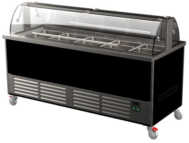 Laitteet » Tarjoilulaitteet » Buffetvaunut » Salaattibaarit » Salaattibaari Restmec MBKL 5 Salaattibaari Restmec MBKL 5 Ulkomitat: (l) 1900 x (s) 799 x (k) 874 / 1183 mm.Liitäntäteho: 0,4 kW / 230 V.Kapasiteetti: 5 x GN 1/1-150.Molemmilla puolilla ylösnostettavat luukut. Lisätiedot › Tarjouksen mukaan Määrä Lisää tarjouspyyntöön Laadukas MBKL 5 salaattibaarivaunu soveltuu erinomaisesti tarjoilukalusteeksi ruokakauppoihin, ravintoloihin ja take away pisteisiin. Kaasujousilla varustetut ylösnostettavat luukut toimivat myös pisarasuojina.Ulkomitat: (l) 1900 x (s) 799 x (k) 874 / 1183 mm.Liitäntäteho: 0,4 kW / 230 V.Kapasiteetti: 5 x GN 1/1-150.Mukana välipienat pienemmille gn-astioille.Käyttölämpötila +2...+8°C.Tuuletusjäähdytysjärjestelmä.Vaunun molemmilla puolilla ylösnostettavat luukut.Luukut jäävät aukiasentoon asiakkaan ottaessa salaattivaunusta, jonka jälkeen luukut ovat suljettavissa.Kalusteessa selkeä digitaalisella näytöllä varustettu lämpötilansäädin.Automaattinen sulatus.Kylmäaine R448A.Laminaattikotelo.Vaunu on helposti liikuteltavissa neljän pyörän ansiosta, joista 2 kpl on lukittavissa.Huom! Lisävarusteena vaunun toiseen tai molempiin päätyihin on saatavilla tarvikekori. Tarvikekoritarve on ilmoitettava tilauksen yhteydessä. Tarvikekori ei sisälly vakiotoimitukseen. Näytä lisää tuotteitaSalaattibaarit tuoteryhmästä Tämäkin laite sopivasti rahoituksella Tutustu ›