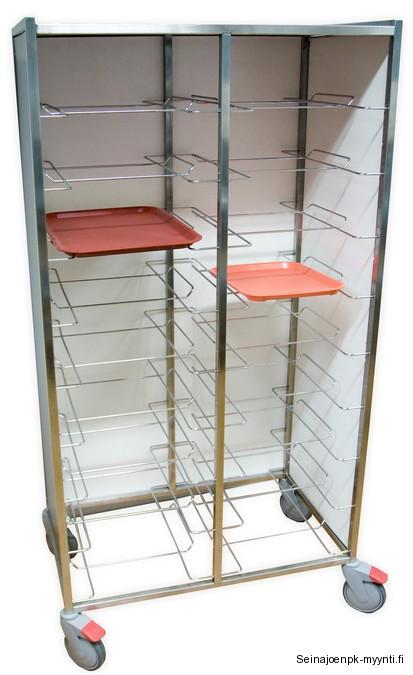 Tarjottimien palautusvaunu P9, ilman laminaattivuorausta Ulkomitat: (l) 490 x (s) 500 x (k) 1590 mm.Johteet 9:lle tarjottimelle (max. 330 x 430 mm).Johdeväli 140 mm.Rakenne ruostumattomasta teräksestä. OSTA Tarjottimien palautusvaunu P18, laminaattivuorauksella Ulkomitat: (l) 830 x (s) 500 x (k) 1590 mm.Johteet 18:lle tarjottimelle (max. 330 x 430 mm).Johdeväli 140 mm.Värivaihtoehdot: wenge, tammi, tumma tammi, pähkinä, pyökki, koivu ja valkoinen. OSTA Astioiden palautusvaunu PAV Ulkomitat: (l) 1160 x (s) 600 x (k) 900 / 1340 mm.Ylähylly mitoiltaan kahdelle ½ astianpesukorille 500 x 250 mm.Työtason alla ulosvedettävä aputaso tarjottimille.Alla myös ohjauskiskot astianpesukorille, johon voi laittaa aterinlaatikot.Vasemmassa päässä on ulosvedettävä pohjahylly jäteastioille. OSTA Tarjottimien palautusvaunu P9, laminaattivuorauksella Ulkomitat: (l) 490 x (s) 500 x (k) 1590 mm.Johteet 9:lle tarjottimelle (max. 330 x 430 mm).Johdeväli 140 mm.Värivaihtoehdot: wenge, tammi, tumma tammi, pähkinä, pyökki, koivu ja valkoinen. OSTA Tarjottimien palautusvaunu P18, ilman laminaattivuorausta Ulkomitat: (l) 830 x (s) 500 x (k) 1590 mm.Johteet 18:lle tarjottimelle (max. 330 x 430 mm).Johdeväli 140 mm.Rakenne ruostumattomasta teräksestä. OSTA