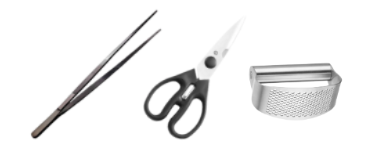 Bongitelineet ja listat Kastike- ja mausteannostelijat Lastat ja skrapat Leikkuulaudat ja telineet Lämpötilamittarit ja ajastimet Mitat Muut keittiön pientarvikkeet Pallovatkaimet, siivilät ja vispilät Patamelat Sekoituskulhot Suolamittari Teräskauhat ja reikäkauhat Vaa''at Veitsenteroittimet ja keittiöveitset